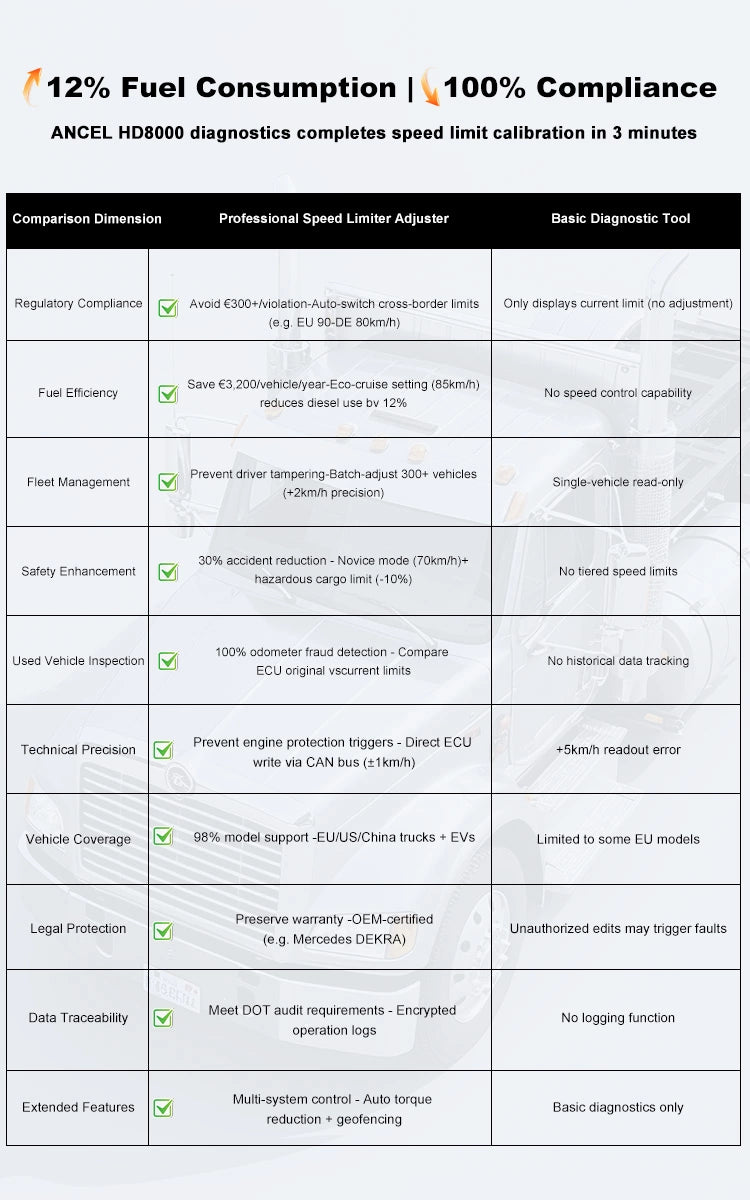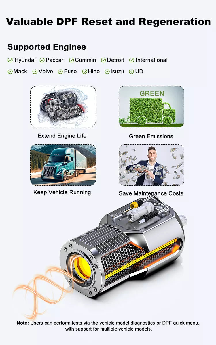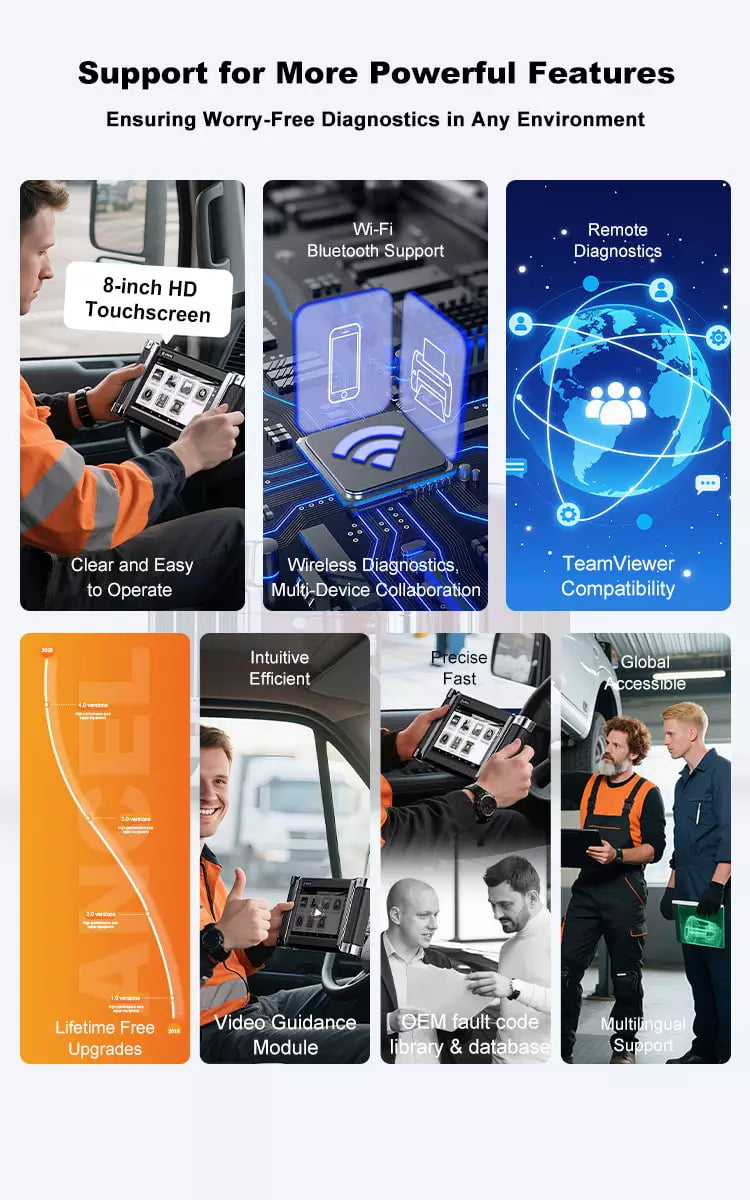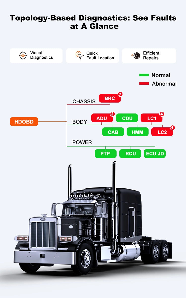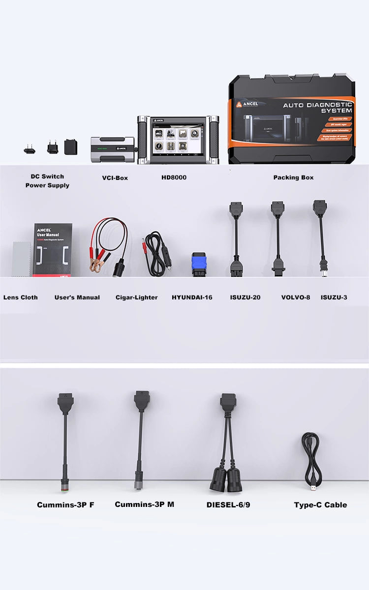 ANCEL HD8000 is a professional-grade heavy-duty truck diagnostic tool that supports comprehensive system diagnostics. Its standout features include DPF regeneration and reset, maintenance light reset, speed limit adjustment, idle time modification, ABS reset and transmission reset, advanced topology mapping, Auto PIN Detect, real-time data monitoring and equation analysis, Consumable Fluids Function, and HDOBD & EOBD functions.