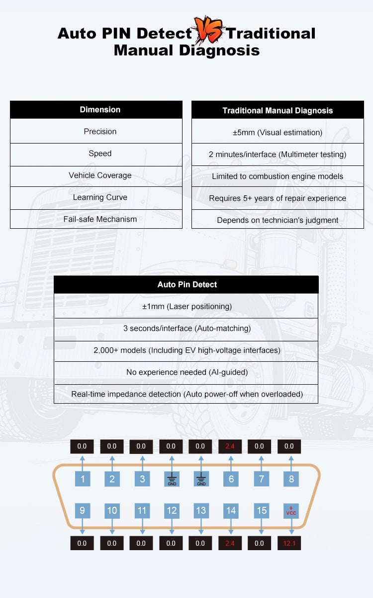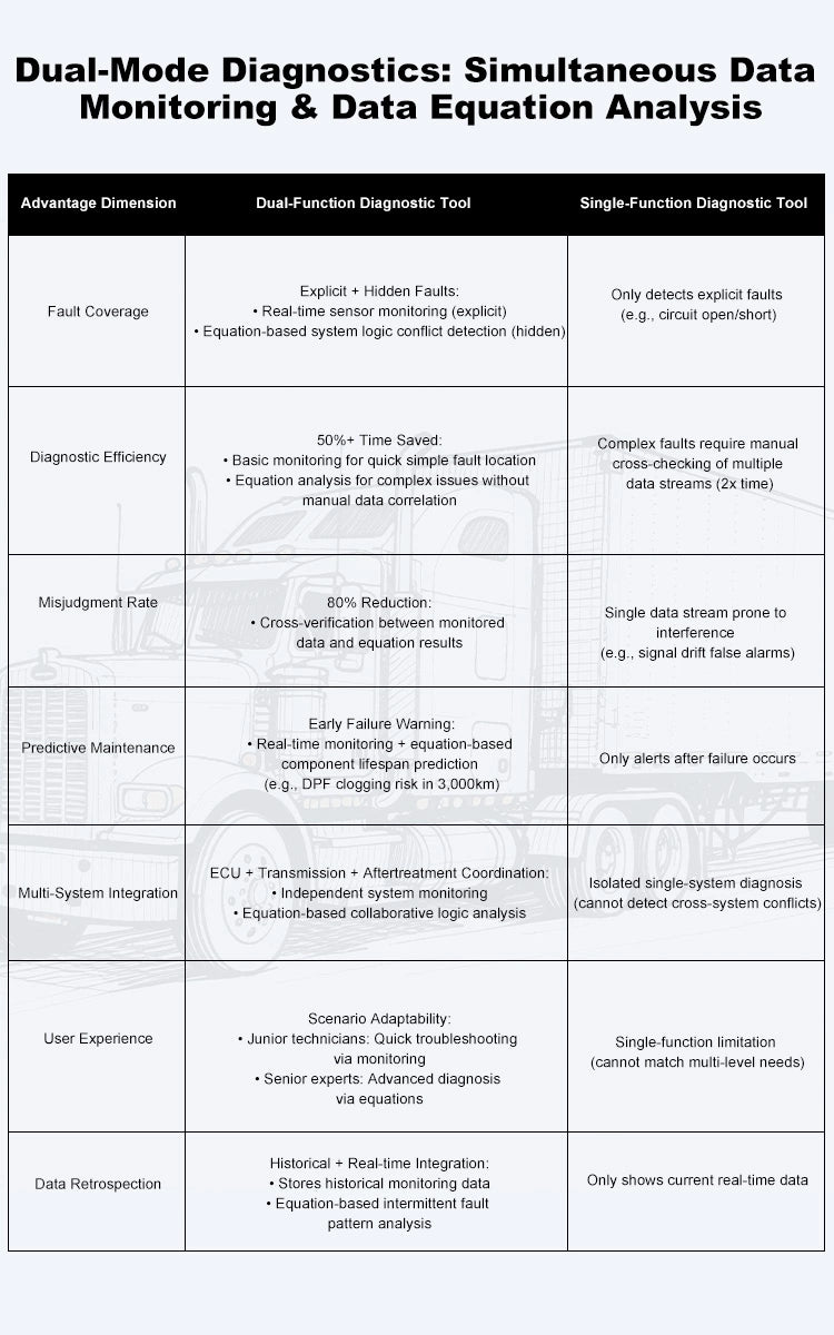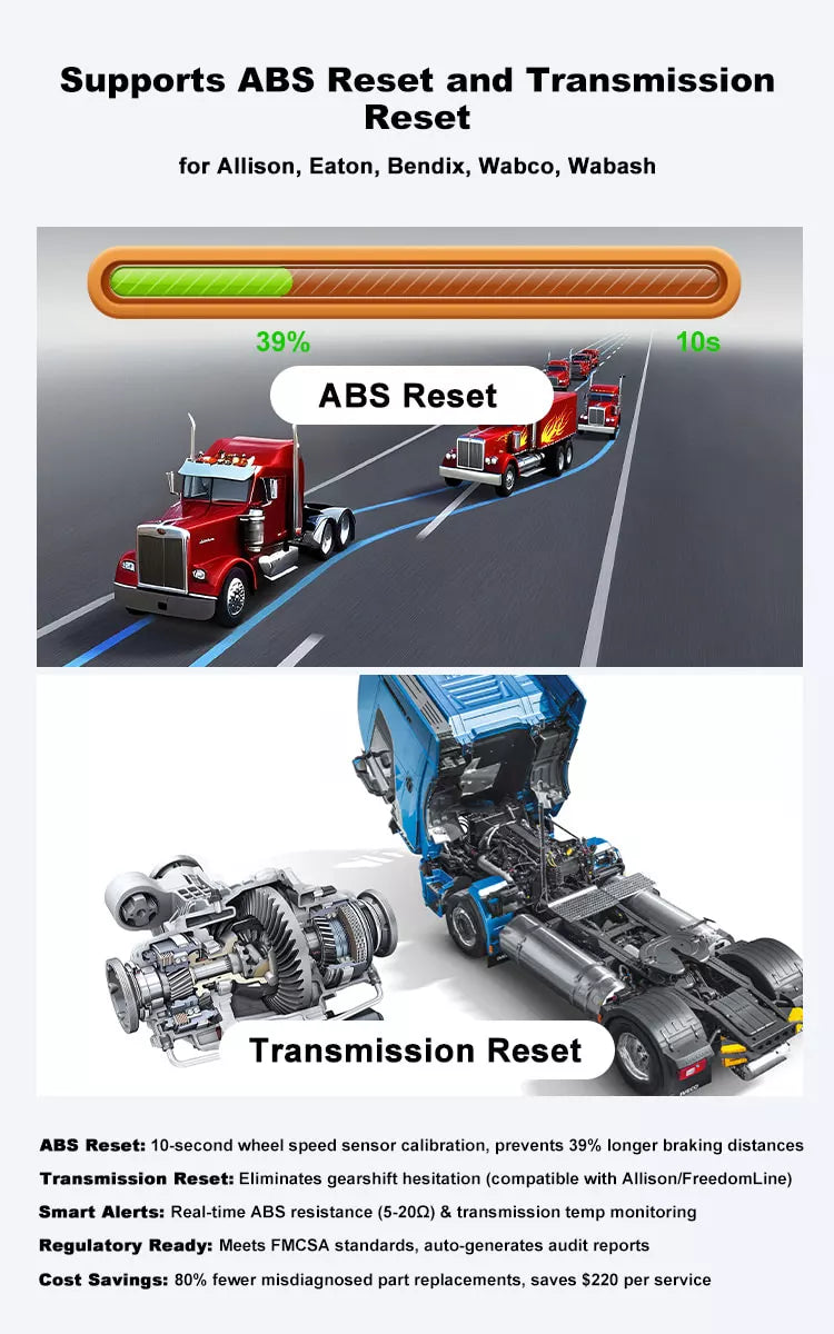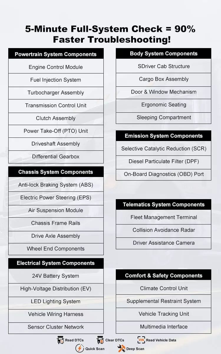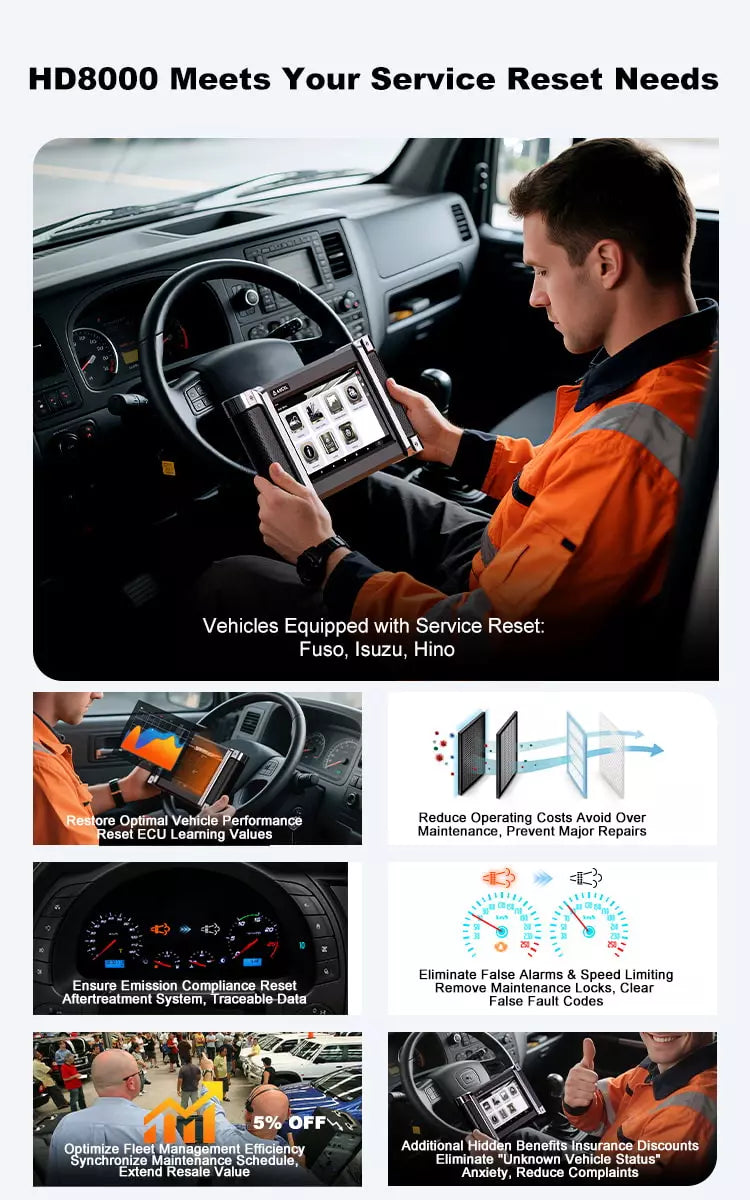 ANCEL HD8000 is a professional-grade heavy-duty truck diagnostic tool that supports comprehensive system diagnostics. Its standout features include DPF regeneration and reset, maintenance light reset, speed limit adjustment, idle time modification, ABS reset and transmission reset, advanced topology mapping, Auto PIN Detect, real-time data monitoring and equation analysis, Consumable Fluids Function, and HDOBD & EOBD functions.