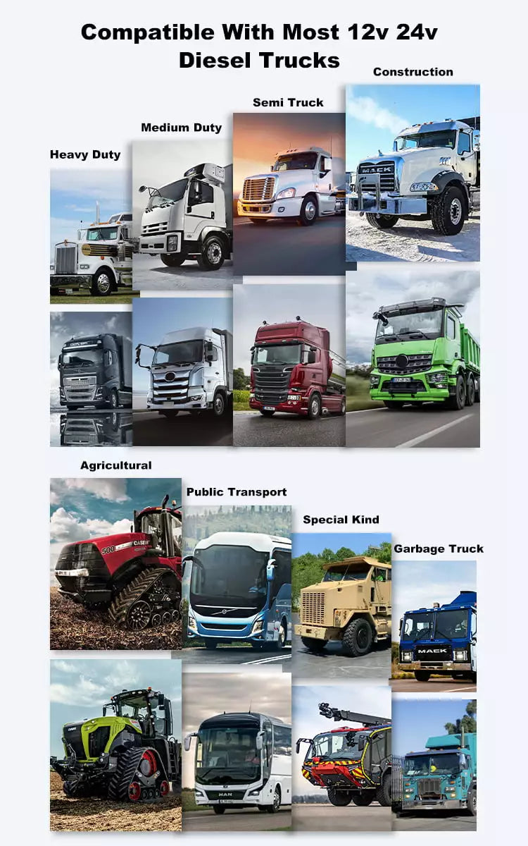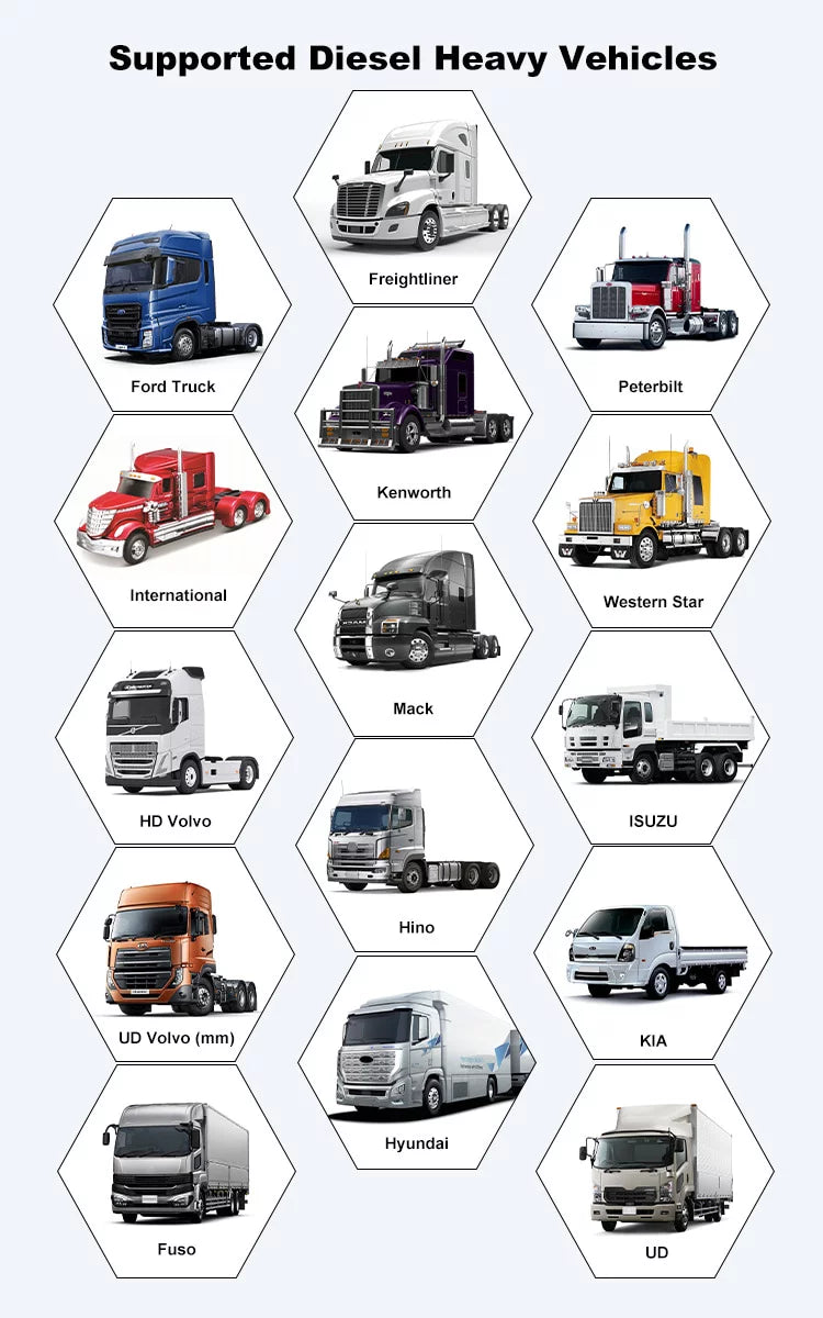 The HD8000 comes with six diagnostic connectors: DIESEL-6/9, Cummins-3P F/M, HYUNDAI-16, ISUZU-20, ISUZU-3, and VOLVO-8, making it compatible with a wide range of vehicles. Supported diesel heavy vehicles include Ford Truck, Freightliner, International, Kenworth, Mack, Peterbilt, Western Star, HD Volvo, UD Volvo (mm), Fuso, Hino, Hyundai, ISUZU, KIA, and UD. Supported diesel engines include Cummins, Detroit, Paccar, and Detroit Pro. It is compatible with most 12V and 24V diesel trucks.