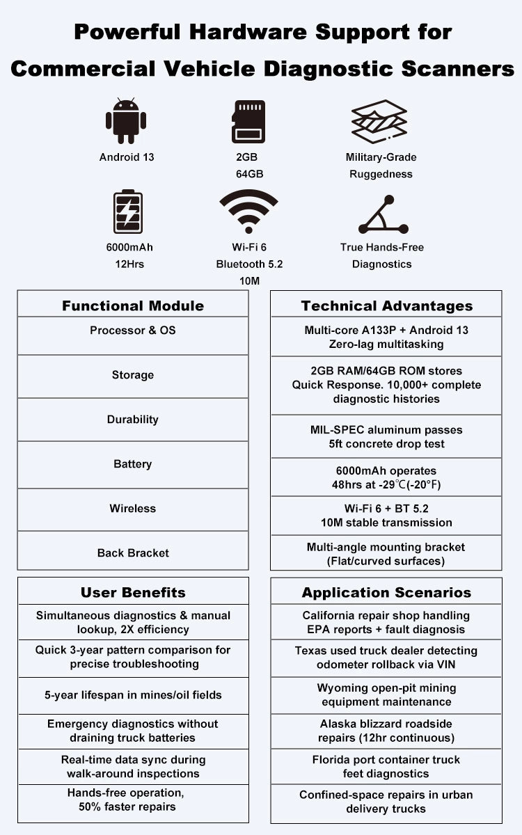 The ANCEL HD8000 is ideal for DIY enthusiasts, truck owners, truck mechanics, and old-school mechanics. Its hardware specs include a multi-core A133P chip with Android 13, 2GB RAM, 64GB ROM for precise diagnostics and massive storage, a rugged and shock-resistant design, and a 6000mAh battery for 12 hours of continuous operation.