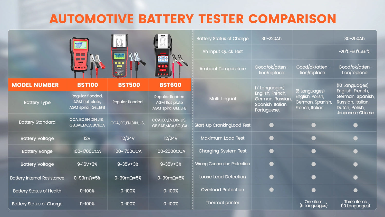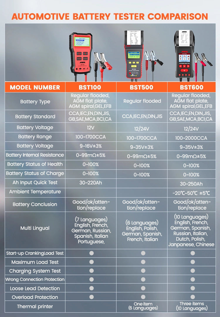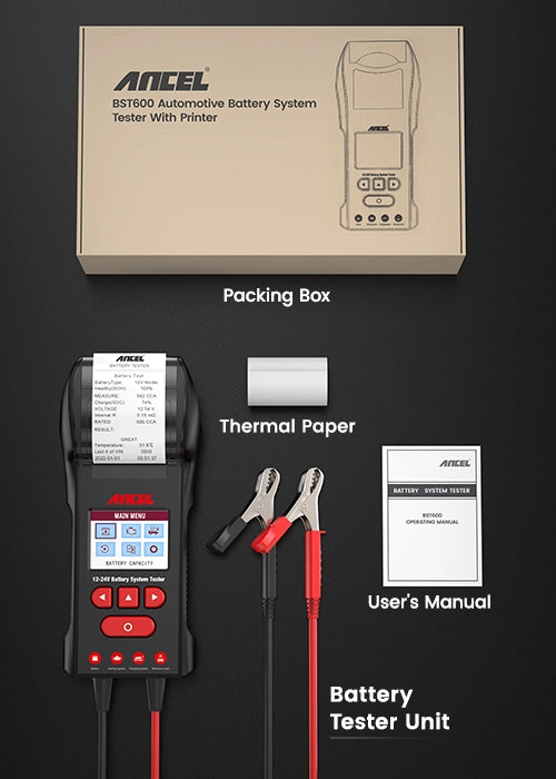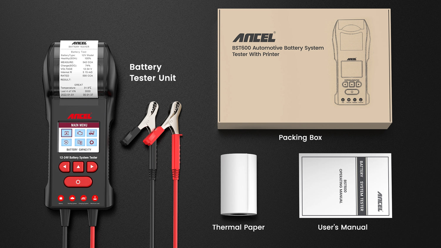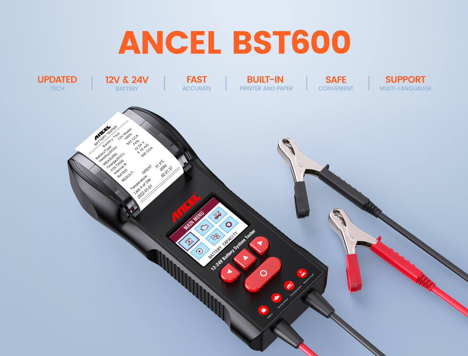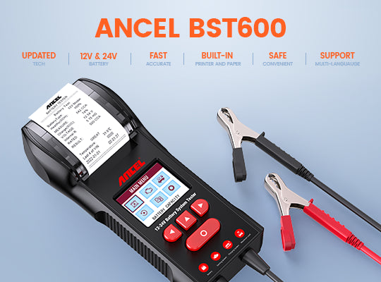 ANCEL BST600 battery load tester is a more advanced battery load test tool with printer,It is can test battery temperature and measure current CCA values.