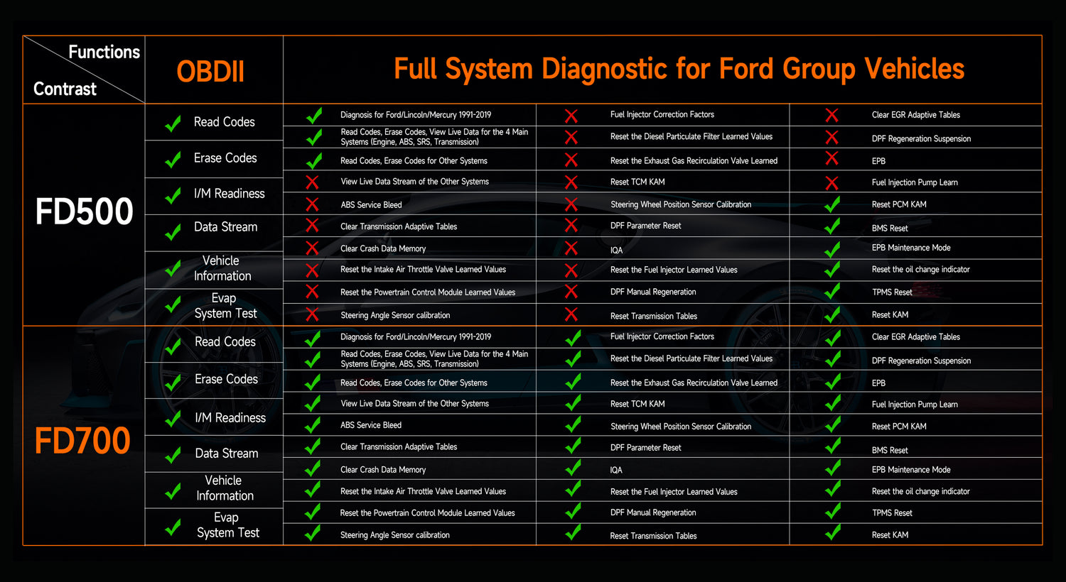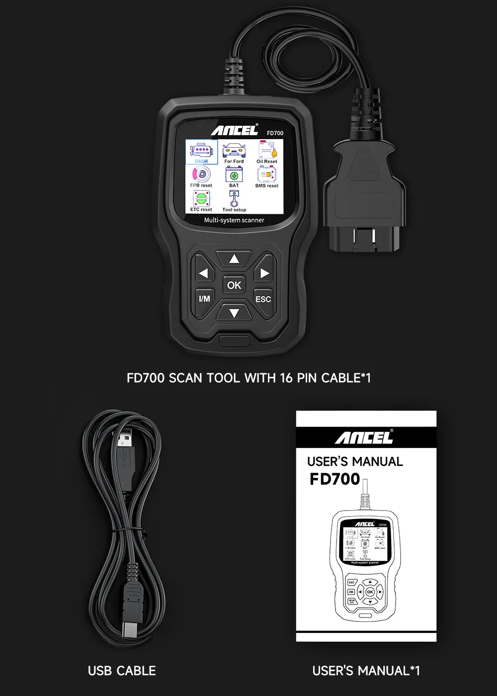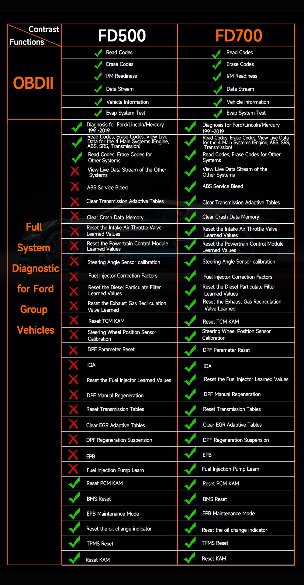 The FD700 scan tool is designed specifically for Ford, Lincoln, and Mercury cars, which can quickly scan and easily access all systems (engine, SRS, TPMS, ABS, SAS, ESP, TCM, CKP, EPB, EPS, BMS, etc.), while supporting the body, chassis, powertrain, and all control modules. It can read and clear fault codes, and has various special functions to help you effectively maintain your car, providing you with good repair assistance while saving time and money.