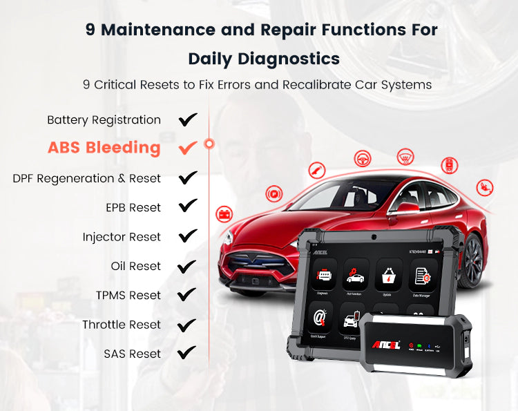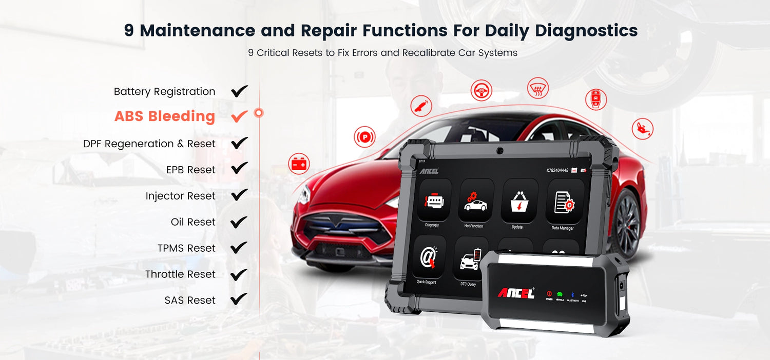 Third, the X7 features quick-access shortcuts for 9 maintenance/reset functions:ABS Bleeding, Battery Registration, DPF Regeneration & DPF Reset, EPB Reset, Injector Reset, Oil Reset, TPMS Reset, Throttle Reset, SAS Reset, allowing users to quickly utilize these features for diagnostics. Note: If you encounter issues while using these shortcuts, you can bypass them and access the desired maintenance functions directly through the vehicle system menu.