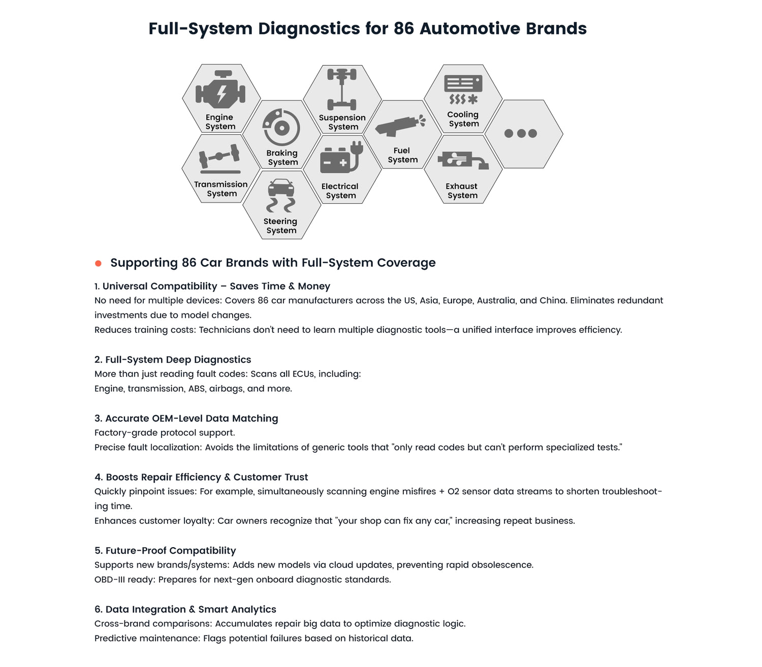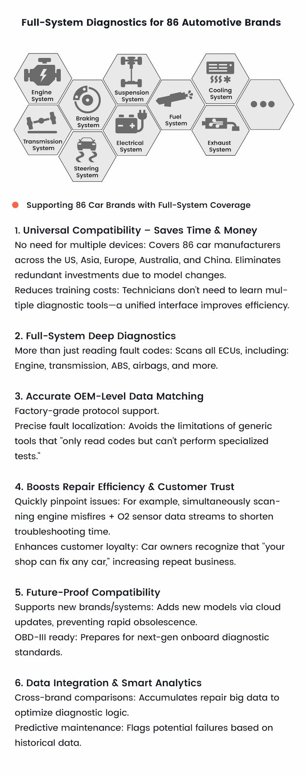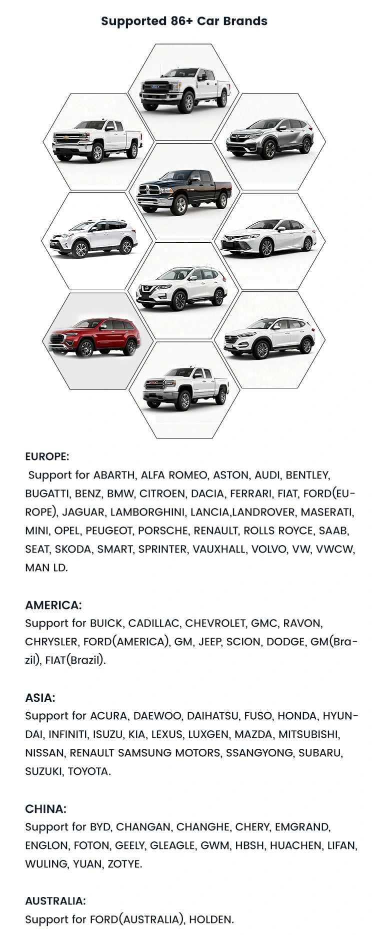First, the X7 supports in-depth, full-system diagnostics for 86 car brands and is available in 13 languages:English, French, Russian, German, Italian, Portuguese, Spanish, Japanese, Korean, Dutch, Polish, Czech, Swedish. Additionally, it supports 12 automotive communication protocols (ISO9141, ISO14230, ISO15765, ISO11898, SAE-J1850 VPW, SAE-J1850 PWM, UDS, K/L lines, High-speed CAN, Middle-speed CAN, Low-speed CAN, and Single-wire CAN), ensuring compatibility with nearly 99% of vehicles worldwide.