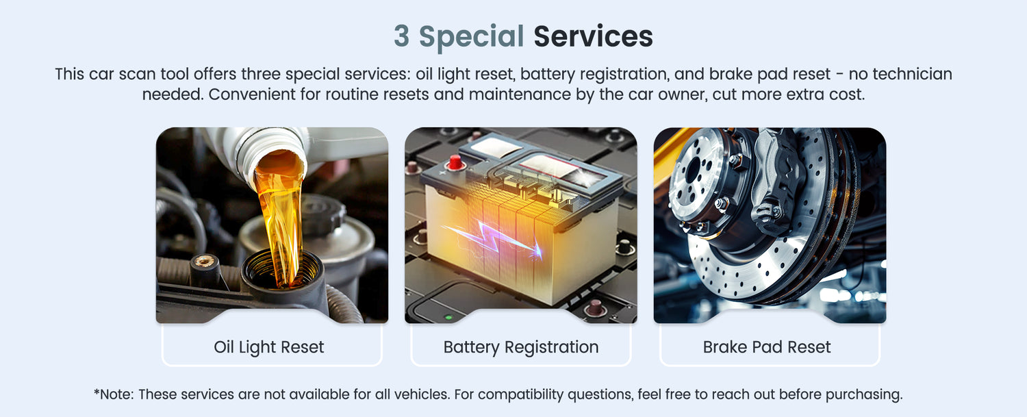 This car scan tool offers three special services: oil light reset, battery registration, and brake pad reset, allowing you to manage routine car maintenance from home.