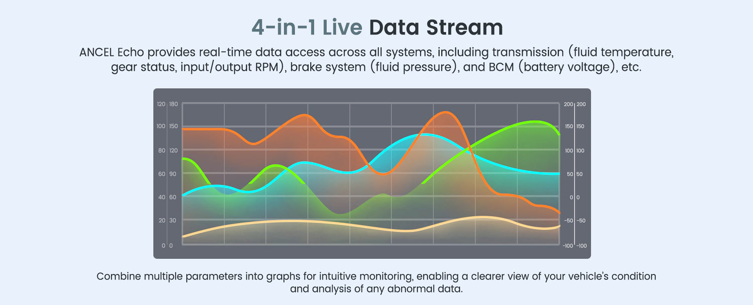 Unlike many diagnostic scanners with limited data streams, ANCEL Echo provides real-time data access across all systems, including transmission (fluid temperature, gear status, input/output RPM), brake system (fluid pressure), and BCM (battery voltage), etc.
