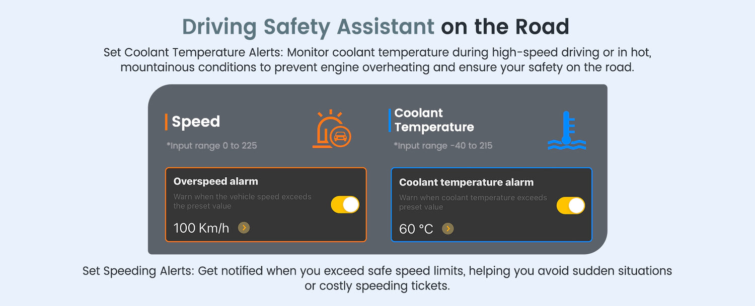 Set Speeding Alerts: Get notified when you exceed safe speed limits, helping you avoid sudden situations or costly speeding tickets.