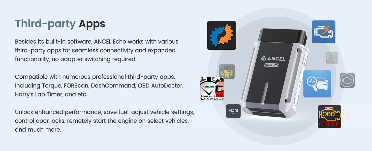 Besides its built-in software, ANCEL Echo works with various third-party apps for seamless connectivity and expanded functionality, no adapter switchingd required.