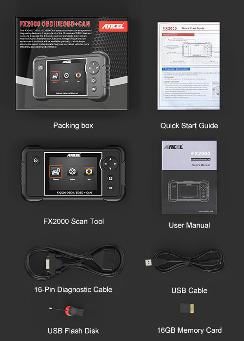 ANCEL FX2000 scan tool is an enhanced version of the general code reader. The diagnostic tool can help detect the engine ignition, fuel injection, air, and fuel ratio, and exhaust emission conditions in the Engine system to enhance vehicle performance, save energy and reduce exhaust emission.