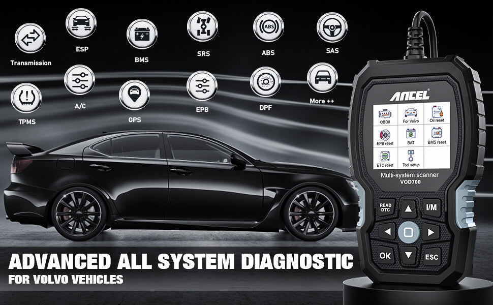 ANCEL VOD700 All System OBD2 Scanner for Volvo Car ABS Bleeding Injector Oil ETC SRL BMS EPB TPMS DPF Reset Tool